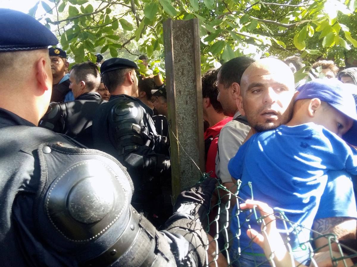 Croatian riot police officers control the access to a refugee camp as more migrants arrive from the serbian border on september 22, 2015 in opatovac, croatia.
